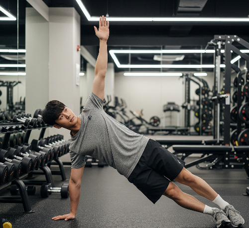 - 꿀팁: 아래쪽 옆구리가 바닥으로 처지지 않도록 복부에 힘을 주고, 옆구리 근육의 수축을 느낍니다.