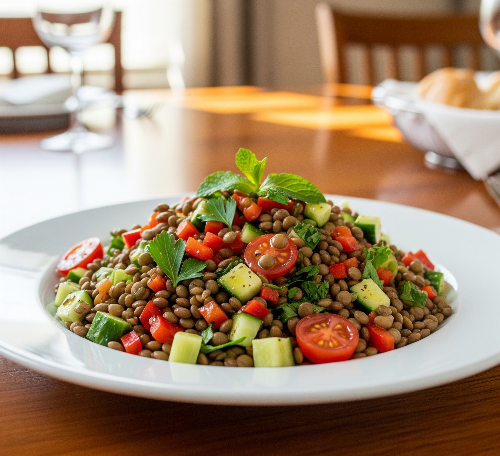 - 재료: 삶은 렌틸콩 1컵, 방울토마토 10개, 양파 1/4개, 오이 1/3개, 올리브오일 3큰술, 레몬즙 1큰술, 소금, 후추 약간